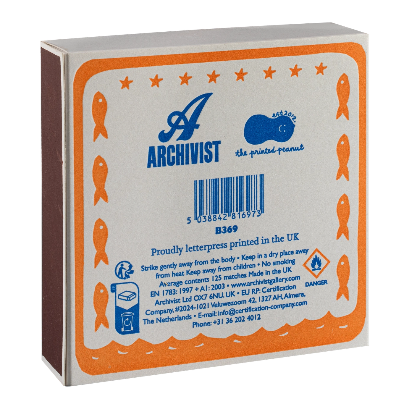 Fallegur eldspýtukassi frá Archivist sem inniheldur 125 stk. af eldspýtum sem eru 10 cm langar.