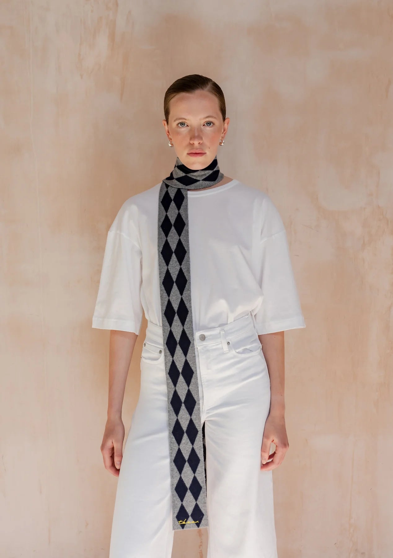 In a season of layering, the smallest pieces can make the biggest entrance. Inspired by vintage showmanship and made from buttery-soft merino wool, this TBCo skinny scarf in a charcoal grey and navy diamond harlequin pattern is a playful twist on tradition. Lightweight and breathable, it’s perfect for the season shift – the kind of scarf you forget you’re wearing, until someone compliments you on it.